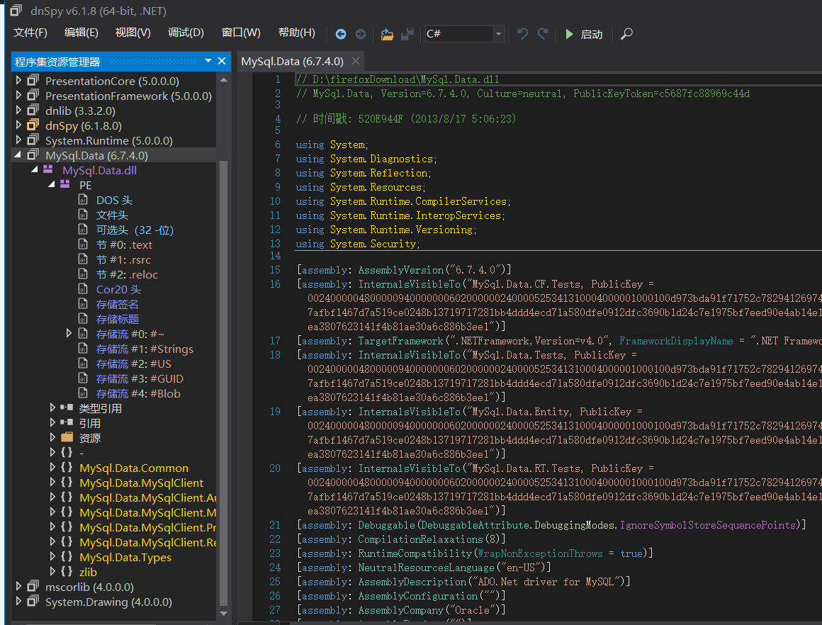 示例的.net文件是从https://dll.website/mysql.data-dll下载的一份MySql.Data.dll文件: