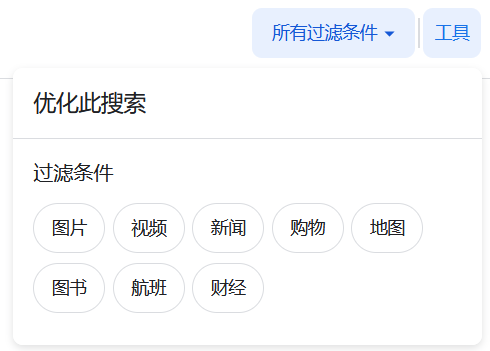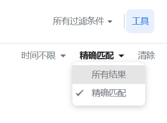 配置更丰富的搜索选项,具体有严格匹配/模糊匹配/不匹配某字词、字词出现在网站的任何位置/title中/文本中/网址中、按语言、地区、更新时间、域名、文件类型筛选结果: