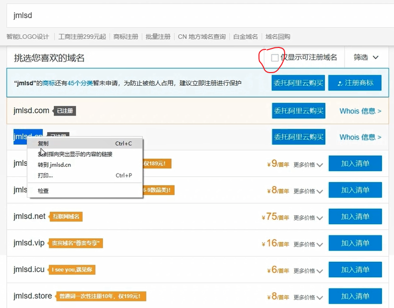变动域名后缀,尝试.cn .com .net .org等后缀。嫌累?:去域名注册平台看看域名有没有注册:
