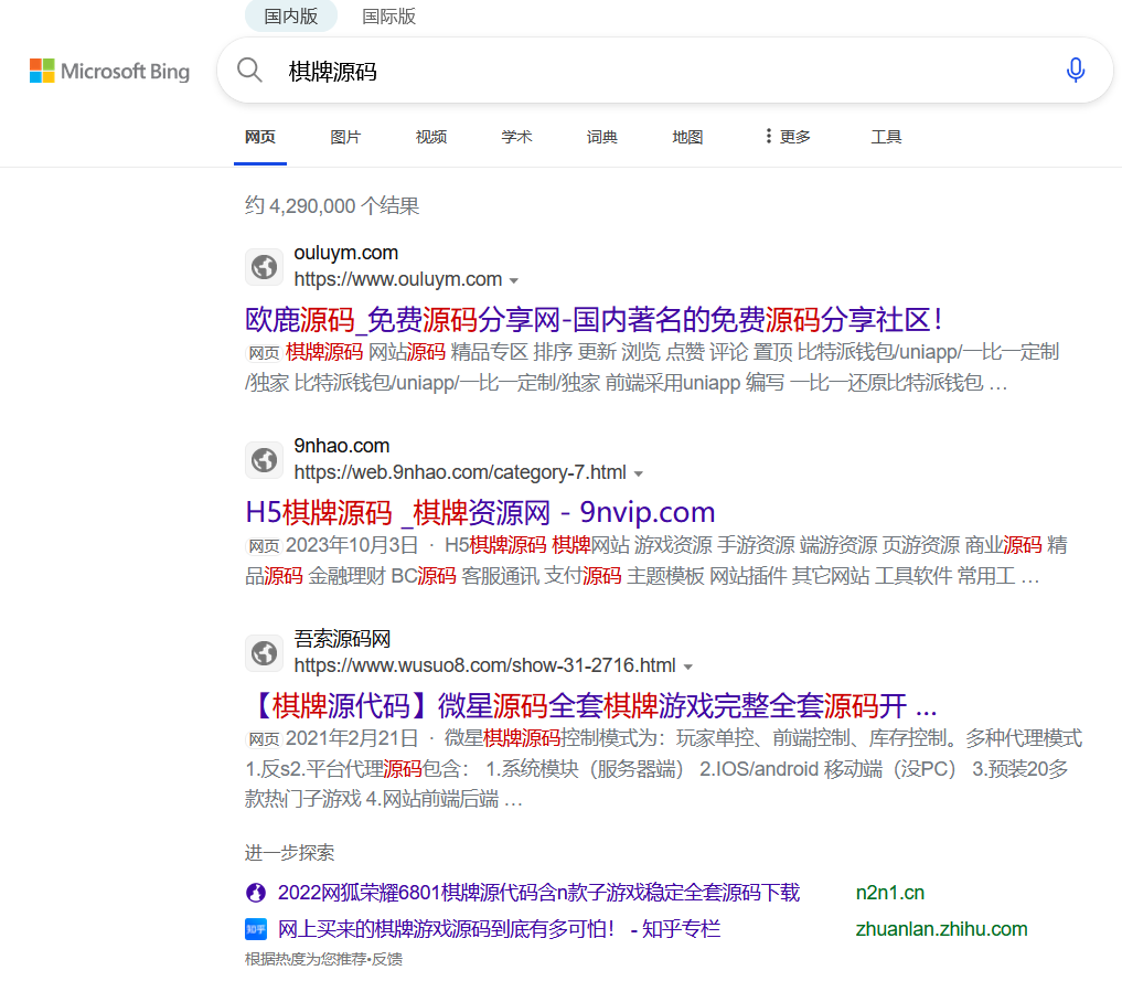 找这种卖黑产源码的电商,不要用百度搜,基于国家不让,百度会屏蔽这些资源。得去bing / google / fofa上搜黑产的关键字,比如“棋牌源码”,给出的网站都可以收藏下,而且挺有用的,排名越靠前说明流量大呀,说明用的黑产站长多呀。
