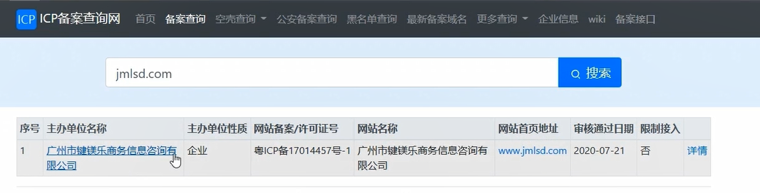 查到公司是广州市键镁乐商务信息咨询有限公司,我们再以公司名为关键词搜信息,例如: